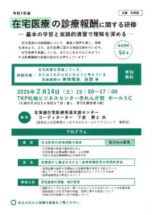 | 対象者 | 在宅医療を実施している、またはこれからはじめようと考えている医療機関の事務職員、医師等 |